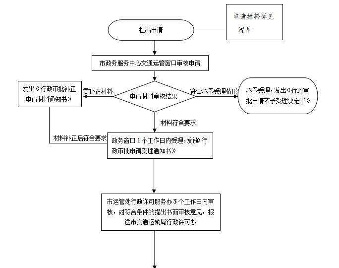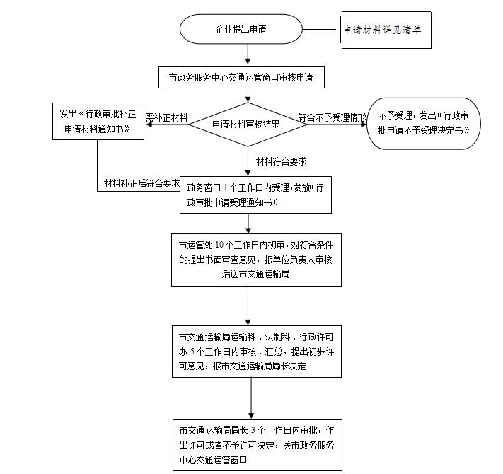 一、事项名称:网络预约出租汽车经营许可 二、事项类型:行政许可 三、审批对象:企业法人 四、审批依据: 《国务院对确需保留行政审批项目设定行政许可的决定》(国务院令2004年第412号)、《网络预约出租汽车经营服务管理暂行办法》(交通运输部等七部委2016年第60号令)、《出租汽车驾驶员从业资格管理规定》(交通运输部令第63号)、《常德市网络预约出租汽车经营服务管理实施细则(暂行)》(常交发〔2017〕104号)。 五、法定期限:20个工作日 六、承诺期限:20个工作日 七、审批条件: (一)具备线上服务能力。线上服务能力按照国家、省有关规定进行认定; (二)具有企业法人资格。企业法人注册地在本市范围之外的,在本市行政区域内必须设立取得工商登记的分支机构; (三)有健全的经营管理制度、安全生产管理制度和服务质量保障制度; (四)网络服务平台数据库接入交通运输行政主管部门监管平台; (五)有与经营规模相适应的固定办公场所,并具有相应的服务、管理能力。配备与车辆规模相适应的管理人员,设有营运管理、安全管理、投诉接待和服务质量管理等专职管理岗位; (六)法律法规规定的其他条件。 外商投资网约车经营的,除符合上述条件外,还应当符合外商投资相关法律法规的规定。 八、申请材料: (一)网络预约出租汽车经营申请表; (二)投资人、负责人身份、资信证明及其复印件,经办人的身份证明及其复印件和委托书; (三)企业法人营业执照及其复印件,属于分支机构的还应提供分支机构的营业执照及其复印件,外商投资企业还应当提供外商投资企业批准证书; (四)服务所在地办公场所权属证明或租赁合同及其复印件,负责人员、管理人员(设有营运管理、安全管理、投诉接待和服务质量管理等专职管理岗位)的相关信息; (五)省级交通运输主管部门会同相关部门对平台公司具备线上服务能力、符合相关要求的审核认定结果及其复印件;注册地在我市网约车平台公司,还应提供由市交通运输主管部门出具的平台公司数据库具备接入其监管平台条件的情况说明及其复印件; (六)经营管理制度、安全生产管理制度和服务质量保障制度文本,包括:(1)接入车辆技术标准和管理制度;(2)驾驶员管理制度;(3)网约车调度规则;(4)安全生产管理制度、网络安全管理制度和内部安全保卫制度;(5)服务质量及投诉管理制度;(6)信息安全及乘客隐私保护制度;(7)平台数据库接入监管平台的维护保障制度;(8)运价制定规则及价格公示制度; (七)法律法规要求提供的其他材料。 九、审批程序: (一)受理 1.岗位责任人:市政务服务中心交通运管窗口工作人员 2.岗位职责及权限: (1)申请事项依法不需要取得行政许可的,应当即时告知申请人予不受理。 (2)申请事项依法不属于本行政机关职权范围的,应当即时作出不予受理的决定,并告知申请人向有关部门申请。 (3)申请材料存在可以当场更正的错误的,应当允许申请人当场更正。 (4)申请材料不齐全或者不符合法定形式的,应当一次性告知申请人需要补正的全部内容,逾期不告知,自收到申请材料之日起即为受理。 (5)申请事项属于本行政机关职权范围,申请材料齐全,符合法定形式,或者申请人按照本行政机关的要求提交全部补正申请材料的,应当受理行政许可申请。 (6)受理或者不予受理行政许可申请,应当出具加盖本行政机关专用印章和注明日期的书面凭证。 3.时限:1个工作日 (二)初审 1.岗位责任人:市运管处工作人员 2.岗位职责及权限 (1)按照许可条件对申请人提交的申请材料进行实质审查。 (2)现场勘查:市道路运输管理处指派2名以上工作人员对企业提交的资料进行现场勘查,制作现场《勘验报告》。 (3)市道路运输管理处根据实质审查结果和《勘验报告》,对符合条件的,提出书面审查意见。 3.时限:10个工作日 (三)复审 1.岗位责任人:市交通运输局运输科负责人 2.岗位职责及权限:对行政审批申请事项、申请材料和初审意见进行复审,提出复审意见,不符合条件的注明原因后退回承办单位;符合条件的呈报分管业务工作的局领导签字。 3.时限:3个工作日 (四)合法性审查 1.岗位责任人:市交通运输局法制科负责人 2.岗位职责及权限:负责对具体行政许可主体资格是否合法,决策权限是否合法,许可的程序是否正当、合法,许可的内容、适用法律法规是否准确等进行审核,并签署合法性审核意见后流转至局行政许可办汇总。 3.时限:2个工作日 (五)决定 1.岗位责任人:市交通运输局局长 2.岗位职责及权限 (1)符合法定条件、标准的,做出行政许可决定。 (2)不符合法定条件、标准的,不予许可,将申请材料退回窗口。 3.时限:3个工作日 (六)告知、送达 1.岗位责任人:市政务服务中心交通运管窗口工作人员 2.岗位职责及权限:送达行政许可决定书或不予行政许可决定书,同意许可的,制作并颁发相应经营许可证件。 3.时限:1个工作日 十、审批流程图: